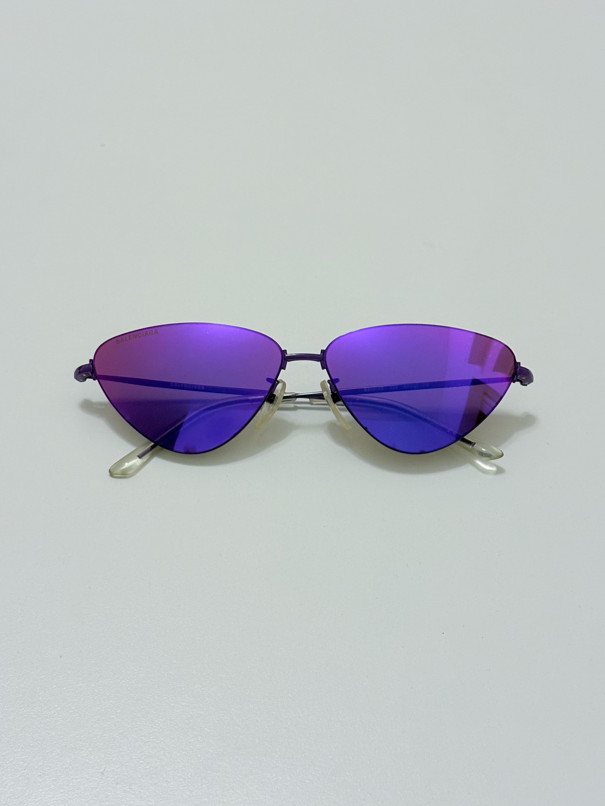Ultra-lightweight, futuristic, and unapologetically Y2K, these mirrored Balenciaga cat-eyes are razor sharp with a femme fatale silhouette. The lenses go full invisible frame mode so all the drama stays in the shape and that vibrant purple reflection.